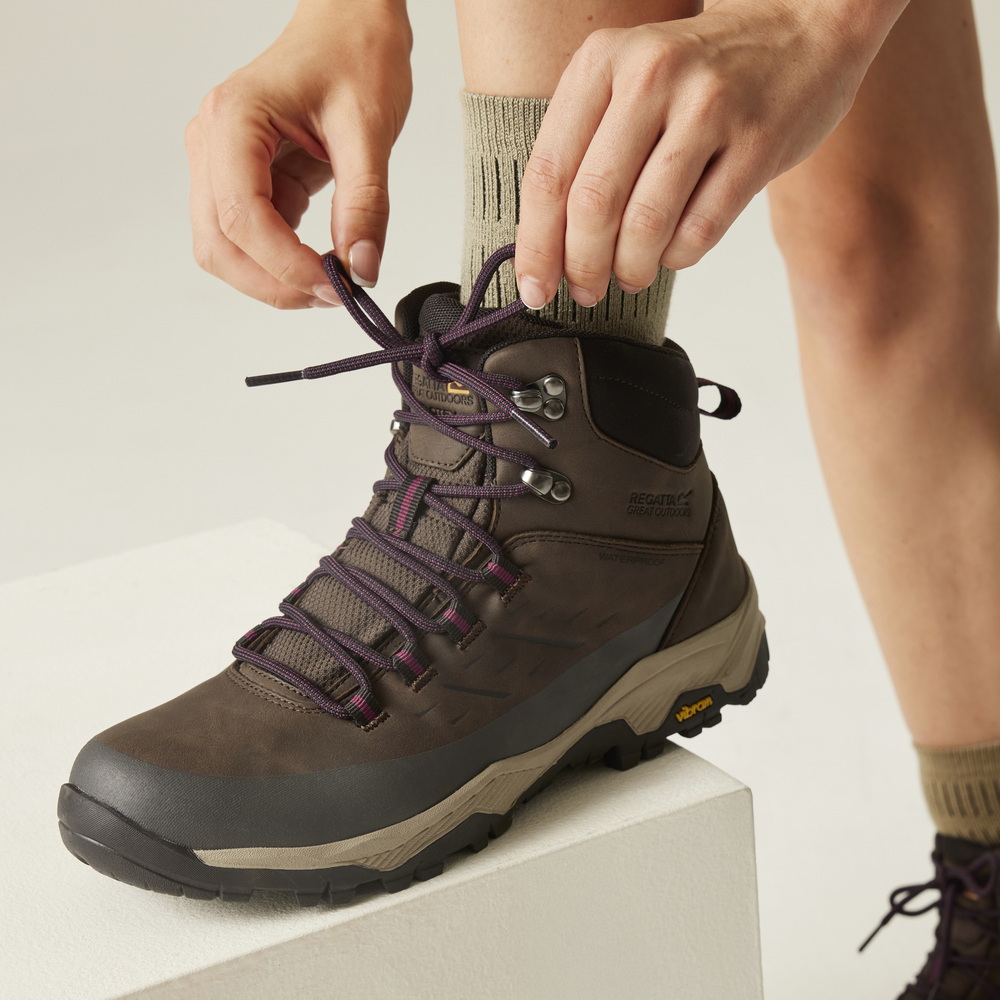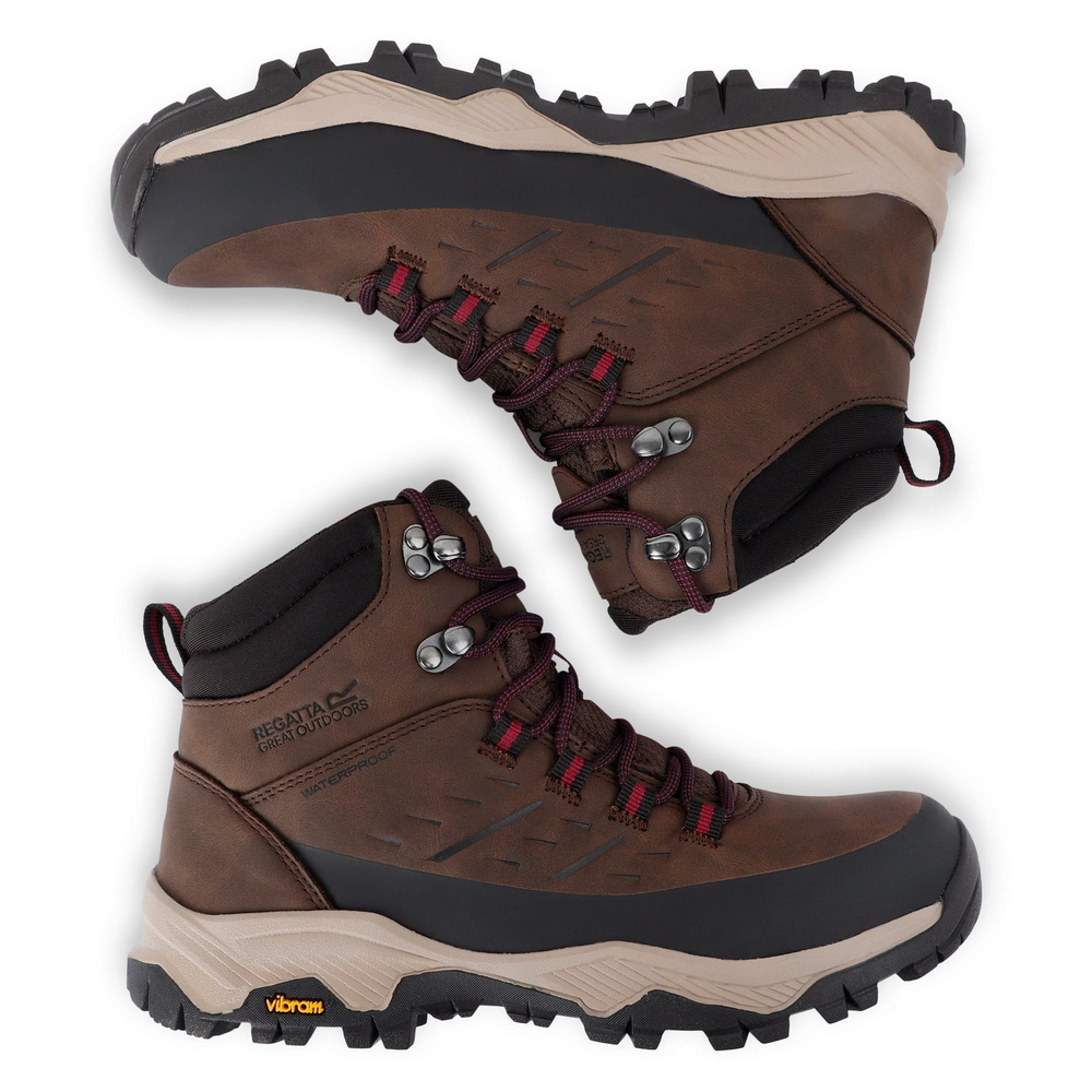Voor grip en stabiliteit vertrouwt Regatta op een Vibram rubberen buitenzool. Die biedt uitstekende tractie op wisselende ondergronden en geeft controle, ook wanneer het pad glad of ongelijk wordt. De rubberen mudguard beschermt je voeten tegen stenen en modder, terwijl het vetersysteem met vergrendelende haak zorgt voor een nauwkeurige en stabiele pasvorm.