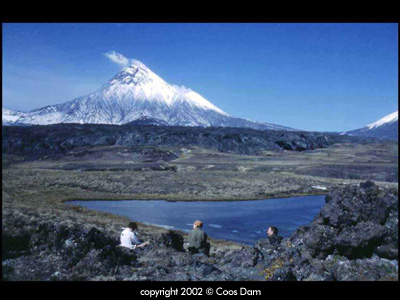 Vanaf onze kampeerplaats hebben we uitzicht op de vulkanen Kamen en Klyuchevskaya, de twee hoogste vulkanen van het schiereiland.