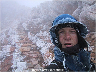 Bij de top van Pico de Teide (3718m), harde wind en ijsregen.