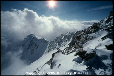 De West Buttress op Denali, gezien vanaf 5200m camp