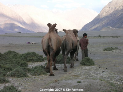 Bactrian Camels in de Nubra vallei (achter gelaten door de handelaren van de zijderoute.)