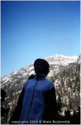 Esther die in de schaduw van een berg staat, met daar boven een strak blauwe lucht.